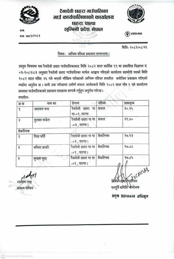 अन्तिम नतिजा प्रकाशन सम्बन्धी सूचना (पद: कार्यालय सहयोगी)