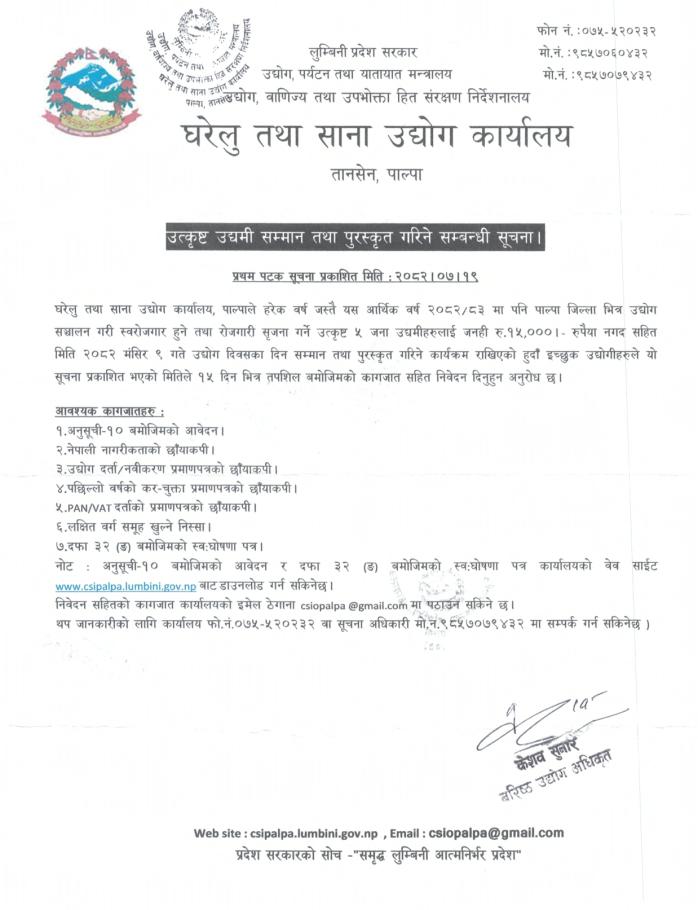 उत्कृष्ट उद्यमी सम्मान तथा पुरस्कृत गरिने सम्बन्धी सूचना