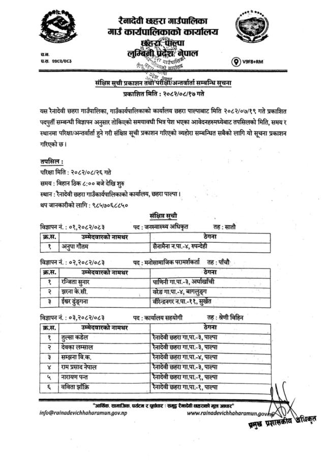 संक्षिप्त सूची प्रकाशन तथा परीक्षा/अन्तरवार्ता सम्बन्धी सूचना