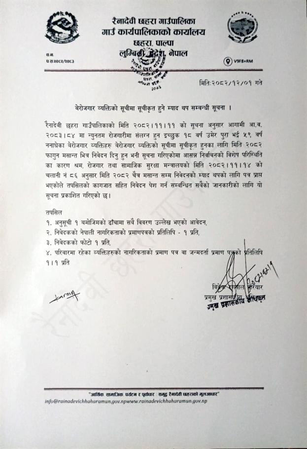 बेरोजगार व्यक्तिको सूचिमा सूचिकृत हुने म्याद थप सम्बन्धी सूचना ।