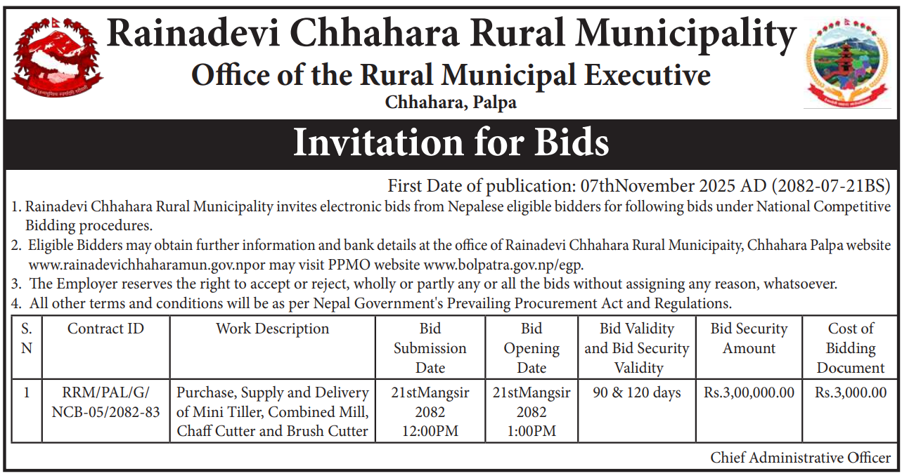 बोलपत्र आह्वान सम्बन्धी सूचना।