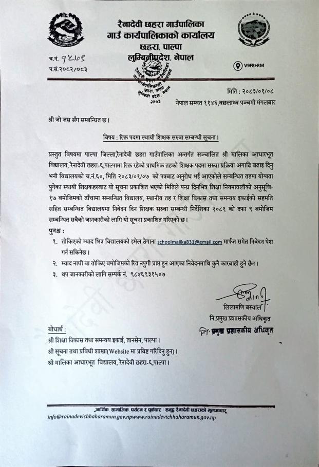 रिक्त पदमा स्थायी शिक्षक सरुवा सम्बन्धी सूचना ।