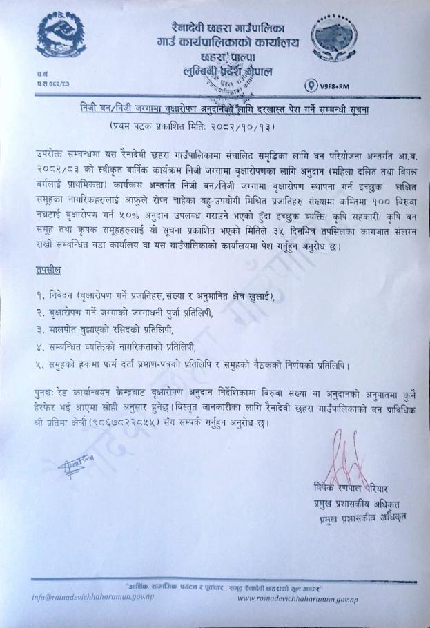 निजि वन / निजि जग्गामा वृक्षरोपण अनुदानको लागि दरखास्त पेश गर्ने सम्बन्धी सूचना ।